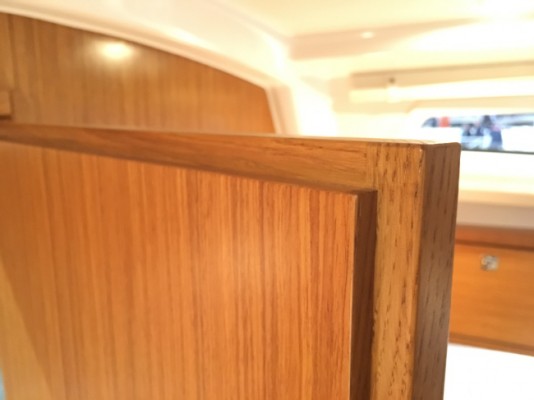 The thickness of the locker edges, solid wood door surrounds and fiddles all add to the overall feeling of quality and style. Forward the use of white panels and teak work well above the V-berth.