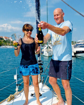 Nick and Jill celebrate taking ownership of Lady J, a Sun Odyssey 45DS