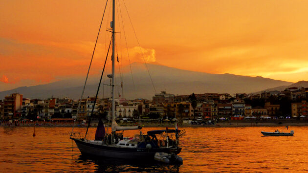 Next was Taormina, and a trip up Etna which throughout our time on Sicily’s east coast produced a magnificently incandescent lava flow with accompanying fireworks. Anchored off Taormina, and dining ashore, Etna deposited ash in our wine, and a violent wind tore the bimini from its frame. Money, money, money!