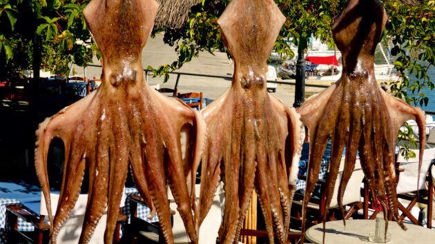We had breakfast in another excellent taverna, its courtyard bedecked with enormous freshly-caught octopus stretched out to dry, which the chef explained enhances the grilling of them. Then south to Zakynthos, whose southern end is the breeding-ground of the loggerhead species of turtle, and unfortunately the stomping-ground of the less attractive species of British merry-maker.