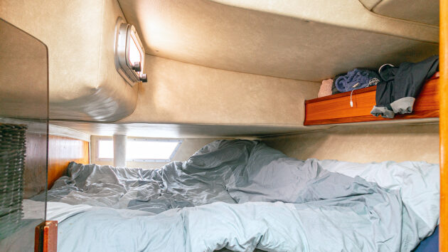 No dark corners in the double aft cabin, thanks to the opening port to the cockpit and the window in the transom. Photo: David Harding