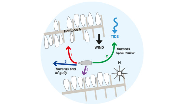 Part of the problem is that as the bow turns to starboard around the pivot point, the stern will swing to port, potentially clipping the downstream boats. Reversing out at this stage is even riskier. In switching gears from forward to reverse there’s a period of time without steerage until reverse water flow is established over the rudder. Meanwhile, with a slight crosswind, the bow will fall off to port, potentially entangling their anchor in the pushpits of the yachts downstream. The manoeuvre’s success depends on how much forwards way they have on, how far into the pen they are, and how quickly the elements are setting them down.
