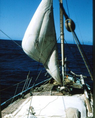 The men just stood and stared in despair, but Beryl went for the buckets. She galvanised them all, and their energy was rewarded with luck. John Guzzwell quickly found nails, a hammer and wood in the chaos below. He worked like a demon to make Tzu Hang watertight again, before another wave took her down for good. Meanwhile, Miles and Beryl bailed, and bailed, and bailed. It took 12 hours to get the water down to the level of the floorboards – had there been any floorboards left.