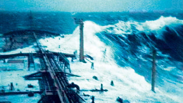 Then there was the Esso Languedoc, caught in a storm off South Africa in 1980. Philippe Lijour, the first mate aboard the oil tanker, was fortunate enough to have a camera handy when the breaking crest of a wave roared past, just short of the top of the ship’s cranes some 25m above the waterline.