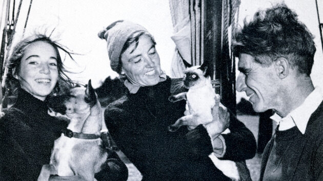 Miles and Beryl Smeeton aboard Tzu Hang with their daughter Clio, and pets