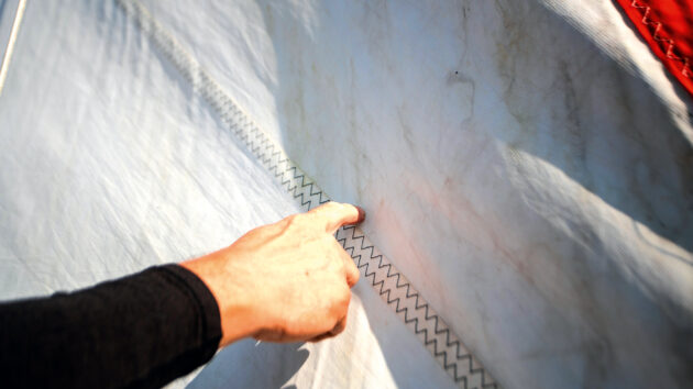 ‘Full length spreader patches that run from the sail luff to 7in or 8in beyond the spreader tips are a good idea,’ he says. ‘They are usually made from a durable self-adhesive sailcloth, but they should be sewn down to keep them firmly in place.’