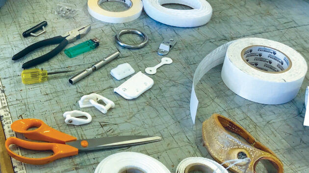 You should also have a sailmaker’s palm and a mix of needles, wax thread and webbing. A roll of Dacron tape is always handy.