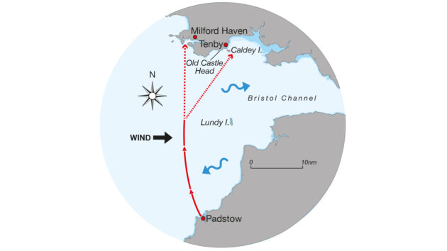 Helen and Mark sail their Halberg Rassy 34, Gemini, in the Bristol Channel. They’ve left Padstow at high water at 0900 bound for Milford Haven, which is 70 miles away on a course of almost due north. The forecast is W, F4-5, veering NW and increasing to F6 towards the end of the passage.
