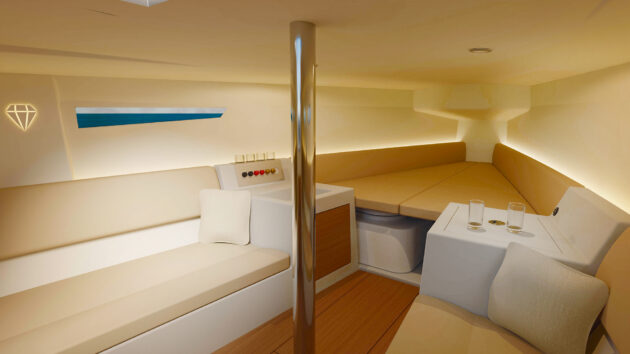 Below decks, the accommodation is commensurately spartan – albeit very stylish. A double V-berth and two settee berths aft offer sleeping for four if you don’t mind not having personal space. There’s space to sit in comfort for four if it’s raining, and views through the hull windows, but definitely not standing headroom. There’s a sink to port, a fridge to starboard, and you can have a chemical toilet under the double.