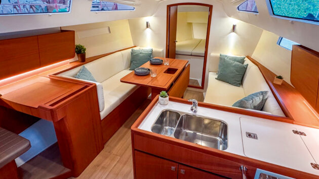 Below decks, the companionway has been improved to make movement between above and below deck easier, while the interior retains the same layout as the J112e with a forward-facing chart table to port and a full galley to starboard, and accommodation in two separate cabins.