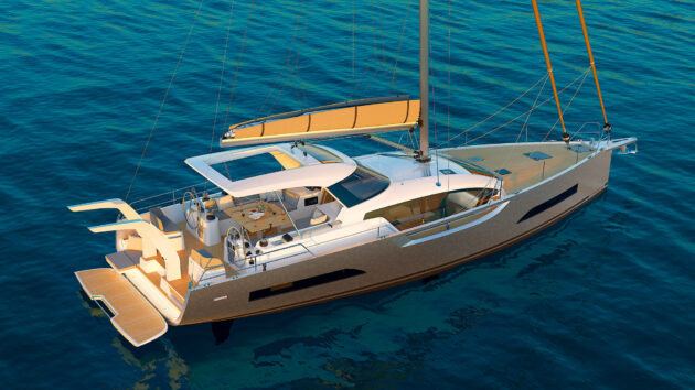 Sailing is all handled from the twin wheels aft, with lines coming to clutches and winches ahead of the helms. Permanent davits stand watch over the bathing platform that closes off the cockpit, or lowers to form another lounge area, with boarding steps to use from the stern when the platform is raised.