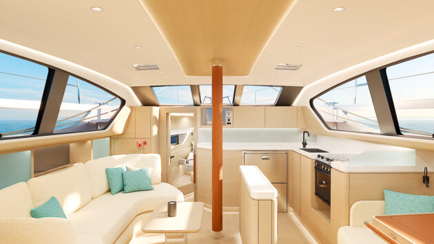 Below decks, the effect is dramatic, with light and views flooding in. The space is dominated by an L-shaped galley, while the saloon seating and nav station look more like luxury lounge areas. What would be wide open spaces have been contained by the presence of the central centreboard case, making for useful bracing, though this doesn’t offer additional seating, preferring ease of circulation instead.